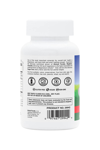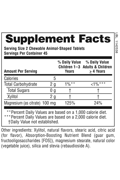 Τα δύο μασώμενα ζωάκια περιέχουν 100 mg υψηλής βιοδιαθεσιμότητας μαγνήσιο. Χωρίς γλουτένη, μαγιά, σόγια,γάλα.