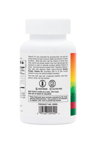 Η πλέον ενεργή μορφή Βιταμίνης D (500IU) σε μασώμενα ζωάκια με θαυμάσια γεύση. Φυτικό, υποαλλεργικό προϊόν. Πρόσφατες μελέτες δείχνουν, τόσο την εξαιρετική σημασία της Βιταμίνης D και την αυξημένη ασφάλεια της, οσο και τα μεγάλα ποσοστά ανεπάρκειας της μεταξύ των παιδιών.
