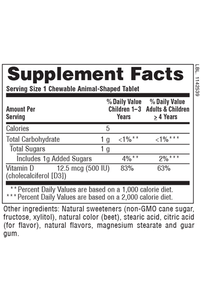 Η πλέον ενεργή μορφή Βιταμίνης D (500IU) σε μασώμενα ζωάκια με θαυμάσια γεύση. Φυτικό, υποαλλεργικό προϊόν.
