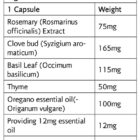 1 Capsule Weight, Rosemary (Rosmarinus officinalis) Extract 75mg, Clove bud (Syzigium aromaticum) 165mg, Basil Leaf (Occimum basilicum) 115mg, Thyme 50mg, Oregano essential oil(Origanum vulgare) 100mg, Providing 12mg essential oil 12mg, Plant cellulose capsule, Non-GMO, Χωρίς φοινικέλαιο, Κατά των δοκιμών σε ζώα, Δεοντολογικά κατασκευασμένο.