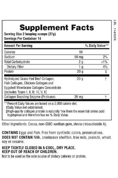 Πλήρες προφίλ φάσματος των 6 κύριων τύπων κολλαγόνου I, II, III, IV, V και X. Περιέχει πρωτεολυτικά ένζυμα για μεγιστοποίηση της απορρόφησης και της αντιφλεγμονώδους δράσης. Το κολλαγόνο είναι μία βασική πρωτεΐνη και αποτελεί το πιο μεγάλο ποσοστό πρωτεΐνης στο ανθρώπινο σώμα.