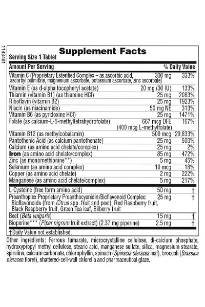 Μοναδική φόρμουλα με σίδηρο (85mg) και άλλα μέταλλα, που έχουν ρόλο κατά της αναιμίας, βιταμίνες του συμπλέγματος Β, L- κυστεΐνη, βότανα πλούσια σε βιοφλαβονοειδή και προανθοκυανιδίνες με ισχυρή αντιοξειδωτική δράση, βιοπερίνη και πράσινα μέρη φυτών (πλούσια σε χλωροφύλλη και ιχνοστοιχεία): μπρόκολο, σπανάκι, σπιρουλίνα, χλωρέλλα κ.ά. Διατίθεται σε ταμπλέτες βαθμιαίας αποδέσμευσης για μεγαλύτερη απορρόφηση και βιοδιαθεσιμότητα.