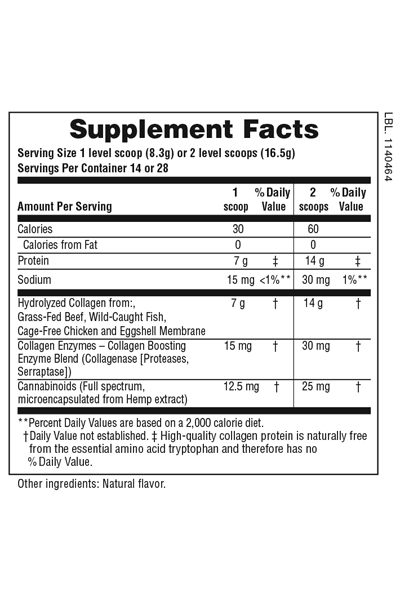Περιέχει 25 mg κανναβινοειδών κάνναβης για να μεγιστοποιήσει τα πολλαπλά οφέλη του κολλαγόνου ενάντια στις φλεγμονές. Πλήρες προφίλ φάσματος των 6 κύριων τύπων κολλαγόνου I, II, III, IV, V και X. Περιέχει πρωτεολυτικά ένζυμα για μεγιστοποίηση της απορρόφησης και της αντιφλεγμονώδους δράσης. Το κολλαγόνο είναι μία βασική πρωτεΐνη και αποτελεί το πιο μεγάλο ποσοστό πρωτεΐνης στο ανθρώπινο σώμα. Παράγεται ενδογενώς από το σώμα και είναι ένα από τα σημαντικότερα δομικά συστατικά του δέρματος, των οστών, των μυών, των τενόντων και των συνδέσμων. Το κολλαγόνο βρίσκεται επίσης σε πολλά άλλα μέρη του σώματος, συμπεριλαμβανομένων των ζωτικών οργάνων, των αιμοφόρων αγγείων, του κερατοειδούς και των δοντιών. Μετά την ηλικία των 30 ετών η παραγωγή κολλαγόνου μειώνεται κατά 1-1,5% το χρόνο και αυτό έχει εμφανείς συνέπειες, εμφανώς στο δέρμα.