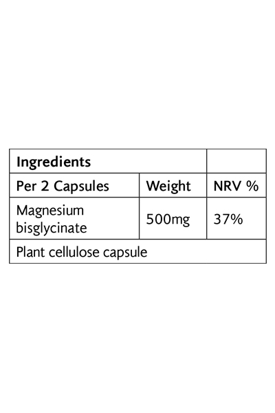 Το δισγλυκινικό μαγνήσιο είναι μια εύκολα απορροφήσιμη μορφή μαγνησίου, ιδανική για να συμβάλλει στη φυσιολογική ψυχολογική λειτουργία και τη φυσιολογική λειτουργία του νευρικού συστήματος. Το μαγνήσιο συμβάλλει στη μείωση της κούρασης και της κόπωσης, υποστηρίζει την ισορροπία των ηλεκτρολυτών, το νευρικό σύστημα, τη φυσιολογική μυϊκή λειτουργία, τη φυσιολογική ψυχολογική λειτουργία και τη διατήρηση φυσιολογικών οστών και δοντιών. Σε αυτό το σκεύασμα, το μαγνήσιο συνδέεται με το αμινοξύ γλυκίνη για να επιτρέψει τη βέλτιστη απορρόφηση και χρήση από τον οργανισμό. Αυτή η βιοδιαθέσιμη μορφή μαγνησίου είναι ήπια για το πεπτικό σύστημα, παρέχοντας 140 mg μαγνησίου ανά δύο κάψουλες.