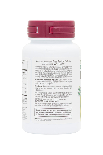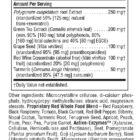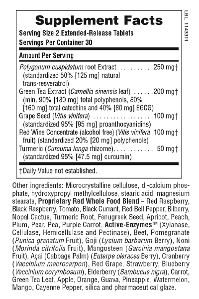 Κάθε συνιστώμενη δόση (2 ταμπλέτες) αποδίδει αντιοξειδωτική ισχύ 7,500 ORAC και περιέχει 125mg ρεσβερατρόλης (Polygonum cuspidatum). Η δράση της ρεσβερατρόλης αυξάνεται στο έπακρο από την παρουσία των άλλων ισχυρών συνεργικών αντιοξειδωτικών: Green Tea (80% σε ολικές κατεχίνες, 40% σε EGCG), Grape Seed (95% σε προανθοκυανιδίνες), Red Wine (συμπυκνωμένο, χωρίς αλκοόλ, 20% σε πολυφαινόλες), Turmeric (95% σε κουρκουμίνη).