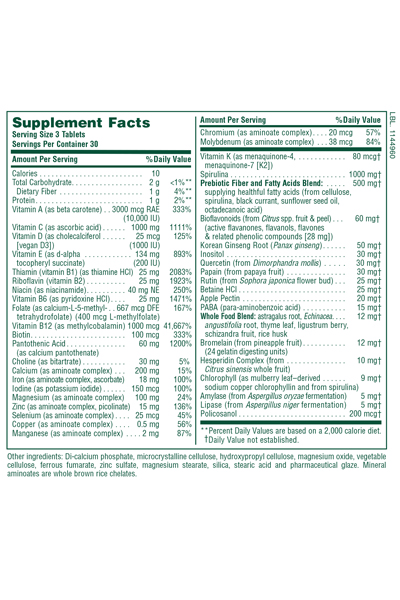 Μοναδική φόρμουλα με 56 διαφορετικά φυσικά συστατικά [Βιταμίνες, μέταλλα, βιοφλαβονοειδή, ακόρεστα λιπαρά οξέα, ένζυμα, πυρηνικά οξέα (DNA,RNA), χλωροφύλλη, σπιρουλίνα, ginseng κλπ].